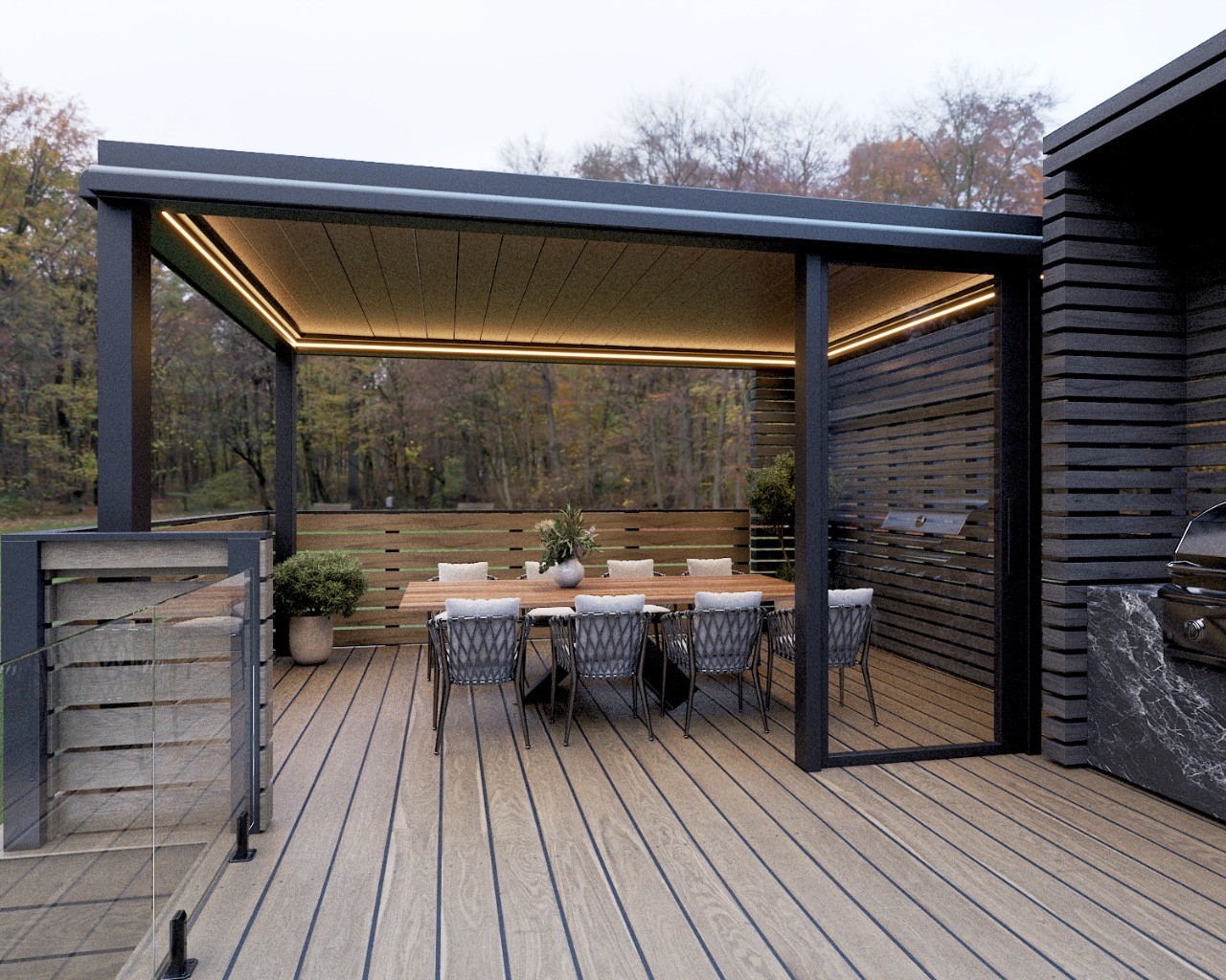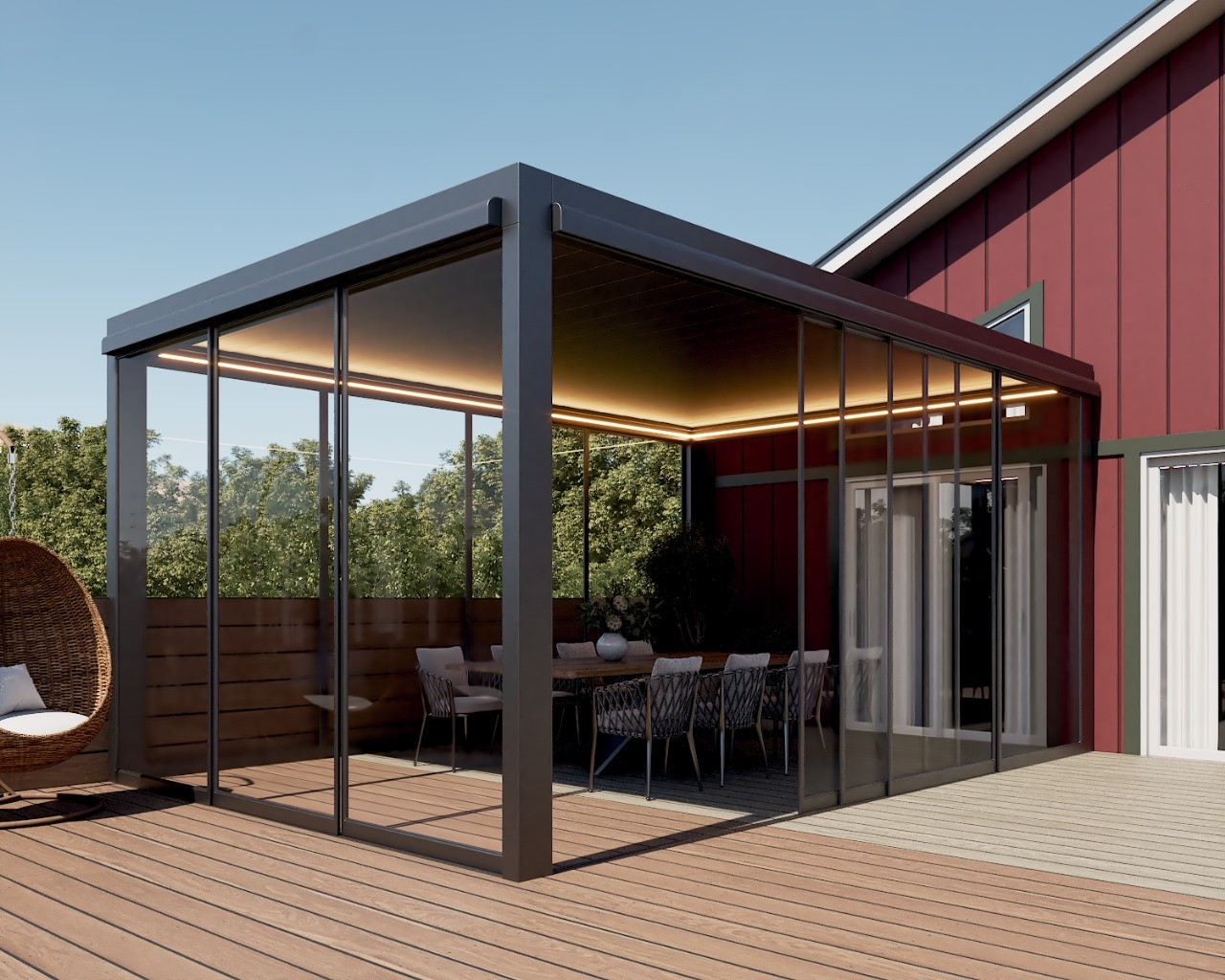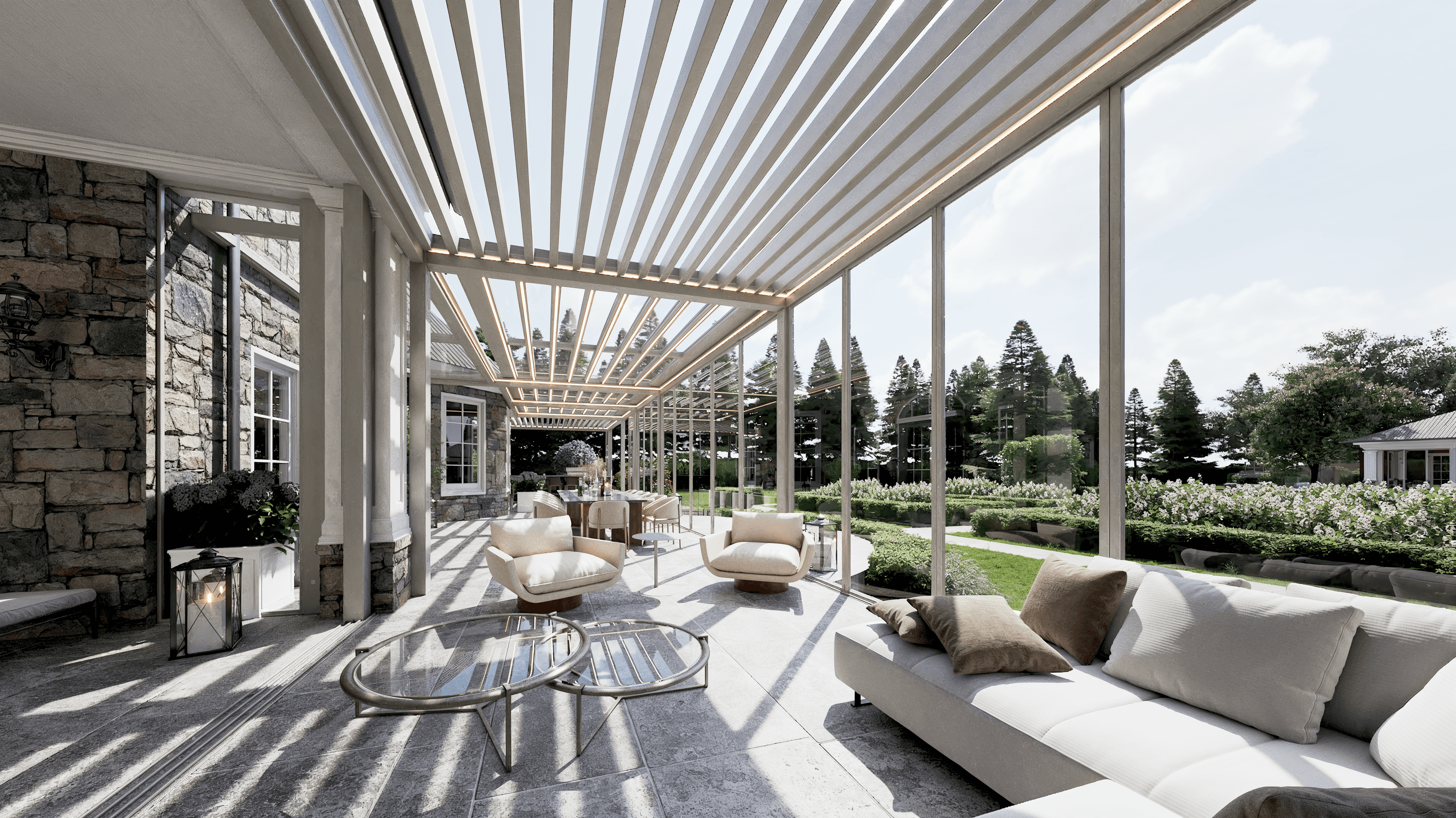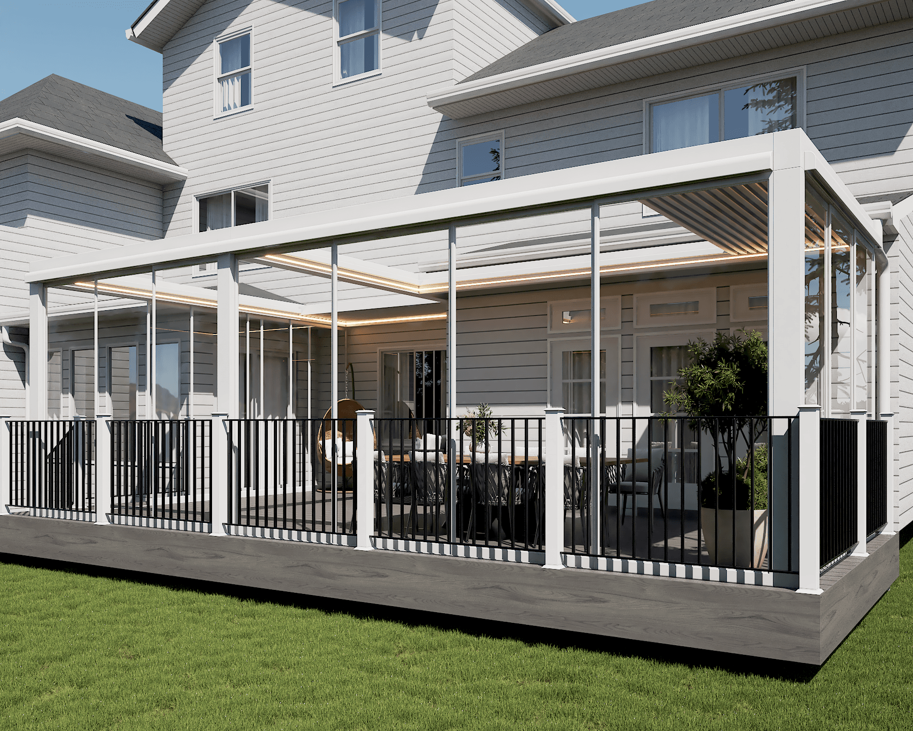 PergolaOne creates next-gen four-season extensions built for modern comfort and convenience. We create rooms that adapt to every season. Open to the sky when you want light. Closed and insulated when you want shelter and warmth. A dynamic space that feels outdoors and indoors at once.